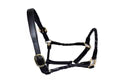 This stunning and unique full grain leather halter has a barrel braided leather design on the noseband and cheek pieces. The padded crown piece has double buckles so it can be easily replaced and has a throat latch clip. Available in brown with brass hardware or black with silver hardware. This unique design is handsome and practical.