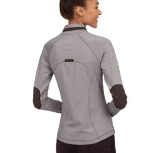 A hi-low length for modest coverage without bunching, beautiful contrast YKK zipper with an inspired bit zipper pull, left side pocket holds a cell phone securely, and thumbholes to keep your sleeve down and hands warm. Suede trimmed stand-up collar that zips down for cooling down apres ride. Suede elbow patches add an classic equestrian charm.