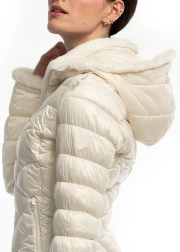 - Goose down filled nylon, faux fur on the hood, collar and cuff