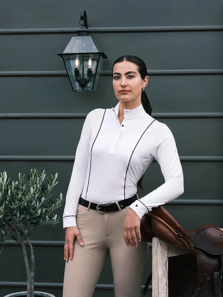 The Constance Heart Horse Show Shirt is a quiet tribute to those once-in-a-lifetime partners- the horses who shape us. Designed with the same refined elegance and performance you love in Constance, this version carries subtle, meaningful details meant just for you.