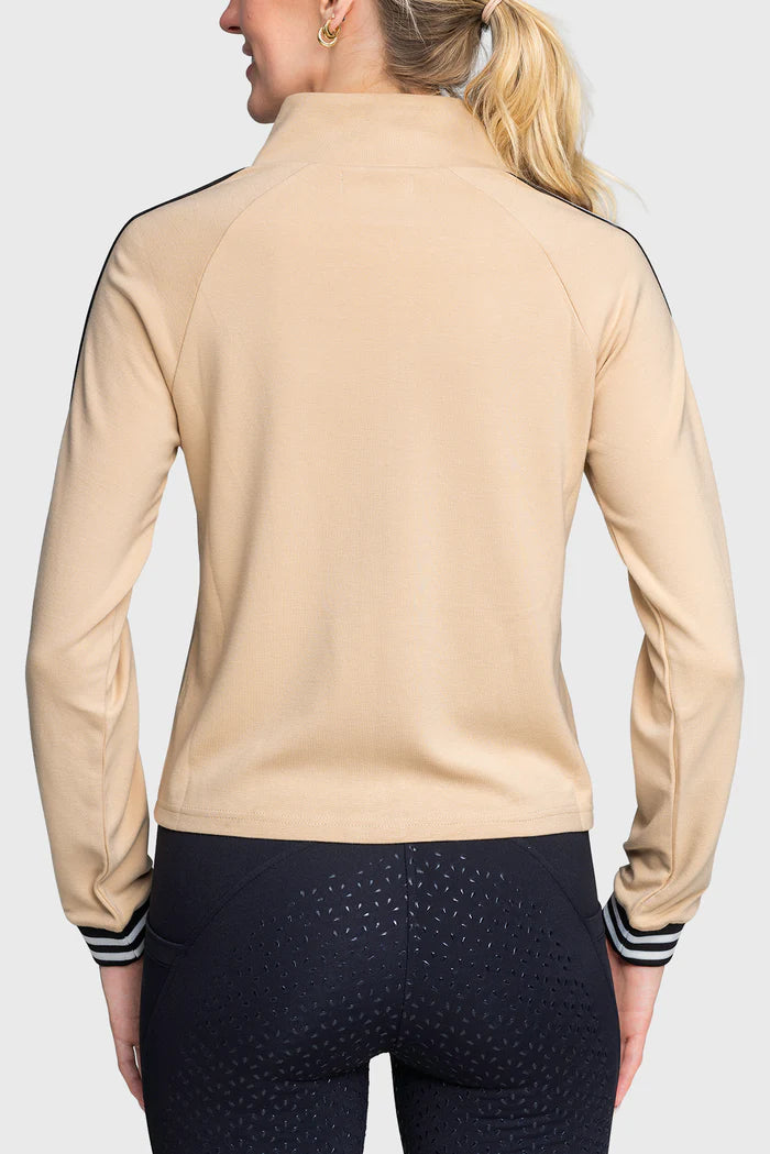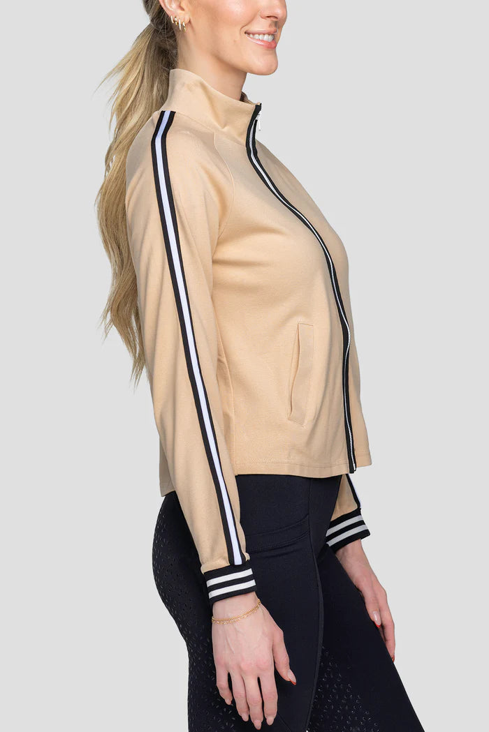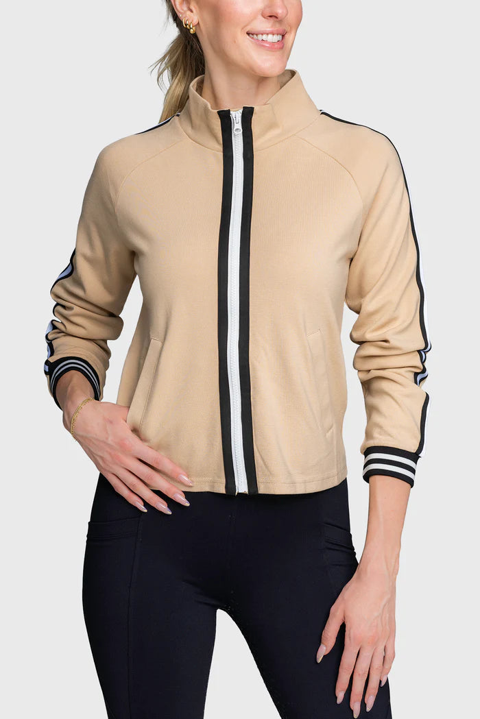 Our contemporary track jacket in classic sand is your perfect layering piece. Modern black and white sporty trim accents the sleeves, cuff, and zipper placket. Two front pockets accommodate your phone and other necessary items. Length hits at the general hip area. UPF 50+.