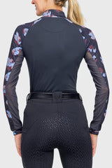 Our rich, contemporary floral features lovely shades of cabernet, mauve and periwinkle with a sleek black ground. UPF 30, ¼ zip, power mesh sleeves and soft 4-way stretch fabric in a contemporary fit.