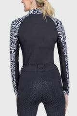 Our sporty silhouette features our feminine climbing vine print in contemporary black and white with a sleek and flattering black bodice. Long sleeves, ¼ zip, UPF 30, breathable power mesh and soft 4-way stretch fabric in a contemporary fit