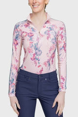 Beautiful shades of pink, blush, fuchsia and soft jade make this tea garden floral a stunner. Long sleeves with sporty stripes, breathable power mesh, 1/4 zip, UPF 30 and soft 4-way stretch fabric in a contemporary fit
