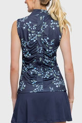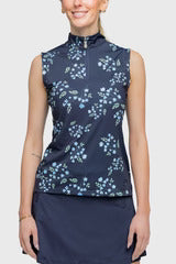 This season’s contemporary ¼ zip bra-friendly tank features our blossom print in rich navy and light blue hues. UPF 30, 9” zipper, soft, 4-way stretch fabric.