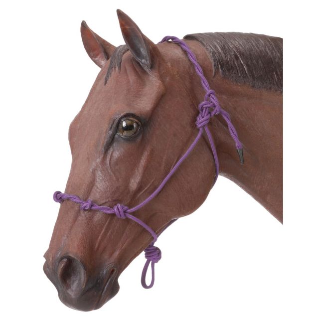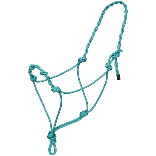 This stiff poly nylon rope halter has a thin diameter with a carefully twisted crown and strategically placed knots along the noseband. These knots are placed on pressure points along the nose for better control while training. Complete with shrink wrapped ends to prevent fraying. A popular choice when teaching young horses to yield to pressure.